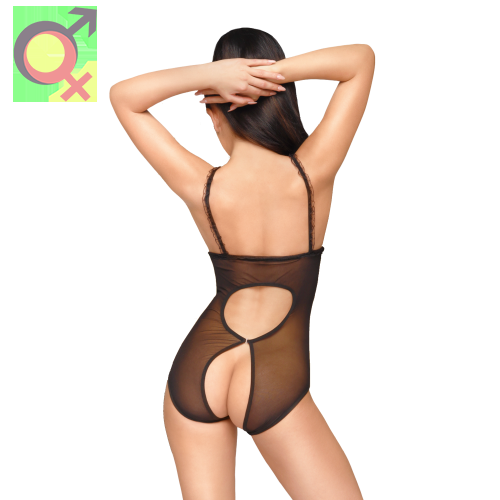 Дизайн выполнен в виде мелкой сетки, дополненной контрастным ажурными вставками, подчеркивающими изгибы тела.