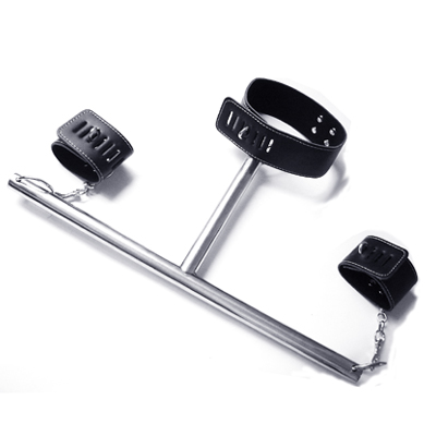 К Т-образной стальной распорке, с помощью карабинов на металлических цепочках, прикреплены ошейник и наручники с регулируемым размером.