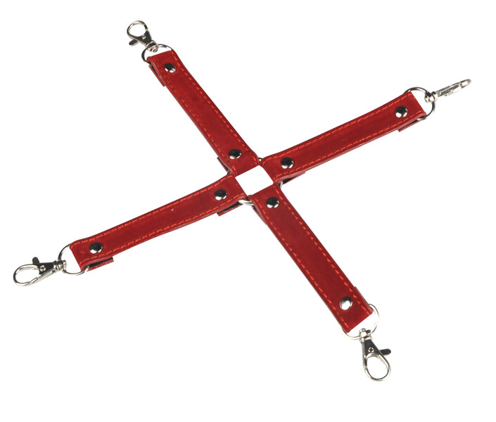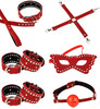 Комплектация: наручники, поножи, ошейник с поводком, кляп-шар на ремешке, маска на глаза, бондажный крест.