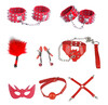 Комплектация: наручники, поножи, ошейник с поводком, кляп-шар на ремешке, маска на глаза, перьевой тиклер, зажимы на соски, бондажный крест.