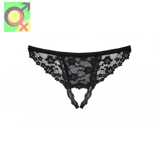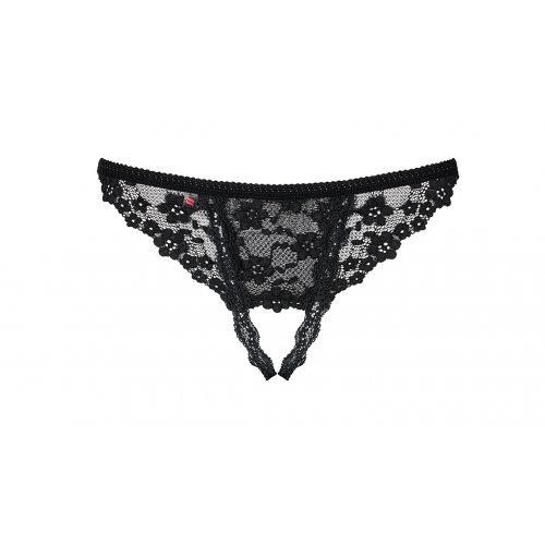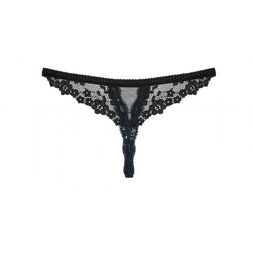 Игривые черные трусики-стринги выполнены из тонкого кружева с цветочным узором