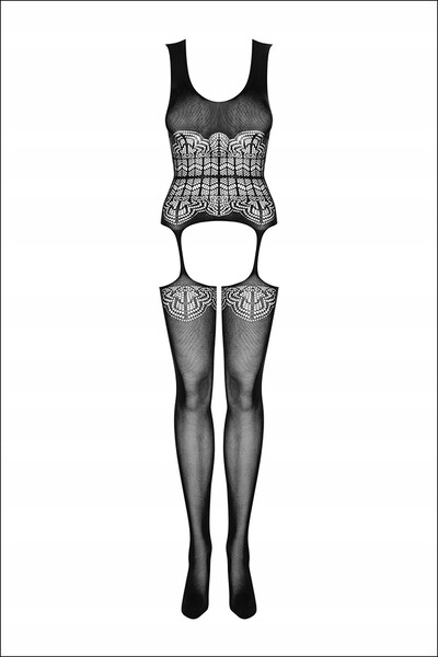 Боди-комбинезон с имитацией топа с чулками выполнен из полупрозрачной эластичной сеточки черного цвета. Топ на бретелях. Чулки соединяются с верхней частью тонкими пажами. Модель украшена орнаментом.