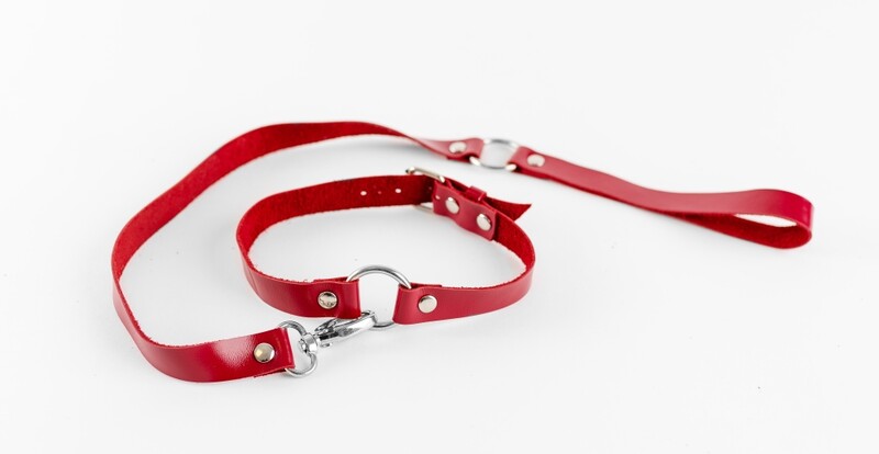 Яркий чокер с поводком, выполненный из натуральной кожи красного цвета. Ширина ремешков 2см. Общая длина поводка 60см, длина петельки 17см. Изделие декорировано двумя металлическими кольцам диаметром 3см. Удобно регулируемая длина чокера подойдет на обхват шеи от 30 до 40см. Нежная натуральная кожа очень комфортна в использовании.