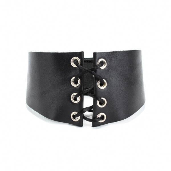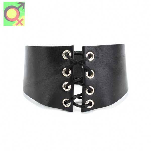 Чокер изготовлен из натуральной мягкой кожи черного цвета, плотно прилегающей к шее. Размер универсальный, регулируются двумя кнопками сзади и шнуровкой спереди. Ширина чокера от 4 до 6см.