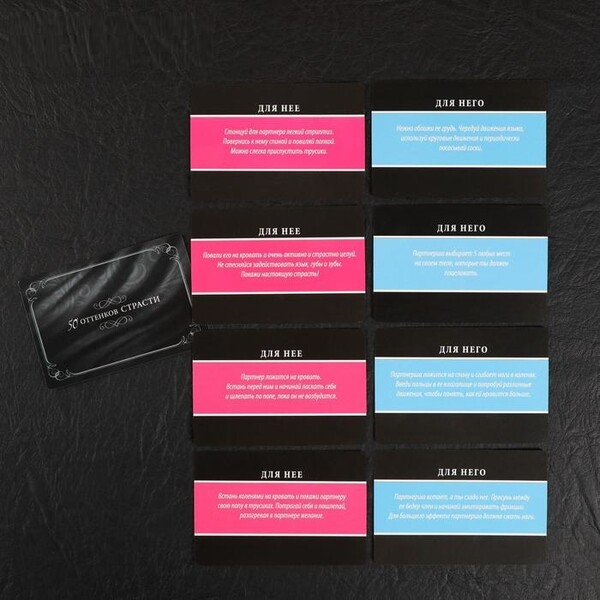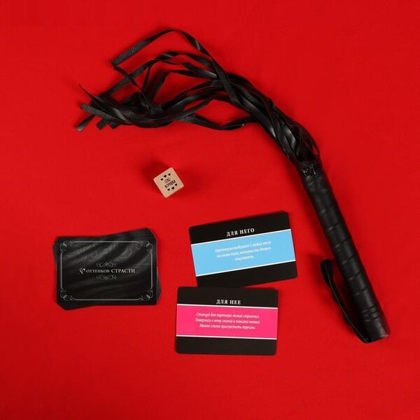 Внутри вас ждут 10 карточек фантами — для него и для неё. По очереди вытягивайте карточки и выполняйте то, что на них написано. Используйте плеть и кубик чтобы сделать игру более пикантной.