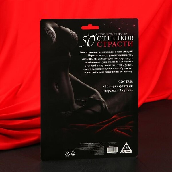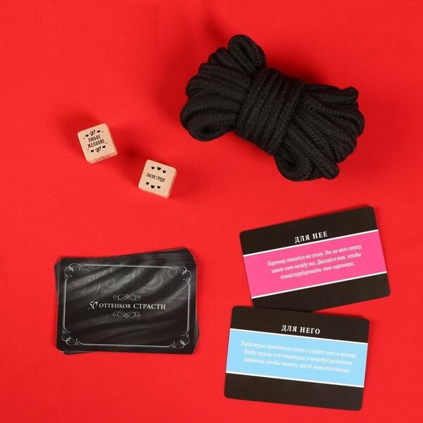 Внутри вас ждут 10 карточек фантами — для него и для неё. По очереди вытягивайте карточки и выполняйте то, что на них написано. Используйте веревку и 2 кубика чтобы сделать игру более пикантной.