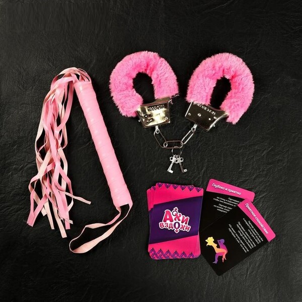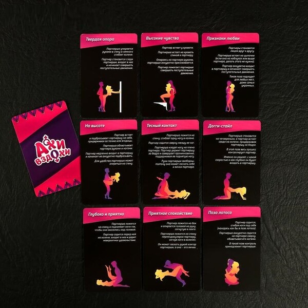 Внутри вас ждёт 10 карточек с фантами, а именно — с секс-позами. Наручники и плётка помогут сделать вечер ярче и интереснее.