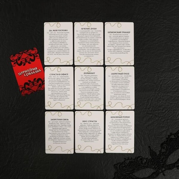 Внутри вас ждут 10 карточек фантами — для него и для неё. По очереди вытягивайте карточки и выполняйте то, что на них написано. Используйте маску и чулки чтобы сделать игру более пикантной.