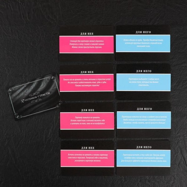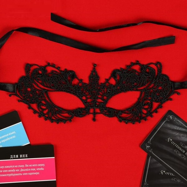 Внутри вас ждут 10 карточек фантами — для него и для неё. По очереди вытягивайте карточки и выполняйте то, что на них написано. Используйте маску и чулки чтобы сделать игру более пикантной.