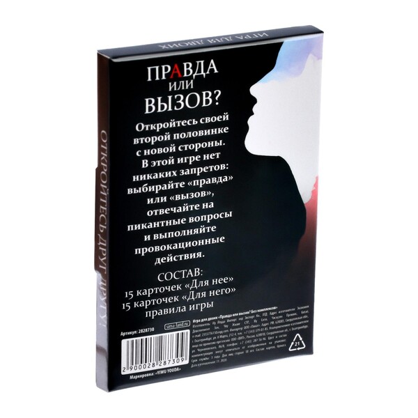 Представляем новинку «Правда или действие? Без комплексов», которая поможет вам открыться своей половинке с новой стороны. Забудьте все запреты, просто отвечайте на пикантные вопросы и выполняйте провокационные задания.