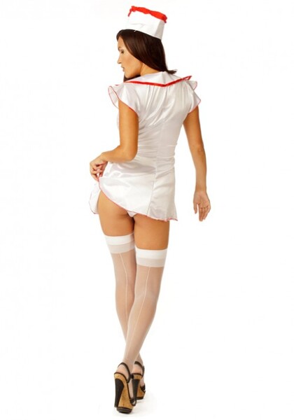 Беленький с красными крупными пуговицами халат, облегающий фигуру, с расклешенной коротенькой юбочкой – эротический костюм медсестры выгодно подчеркивает фигуру. Симпатичная медсестричка сможет сделать романтическую встречу горячее.