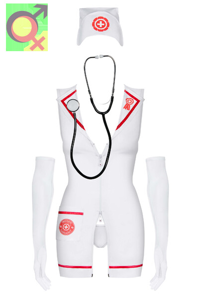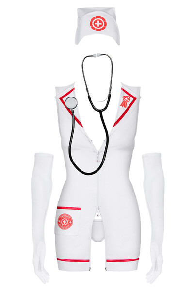 В комплект входят: платье, сексуальные трусики, аксессуары медсестры и головной убор.