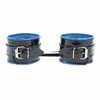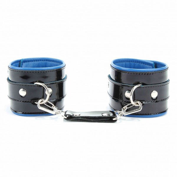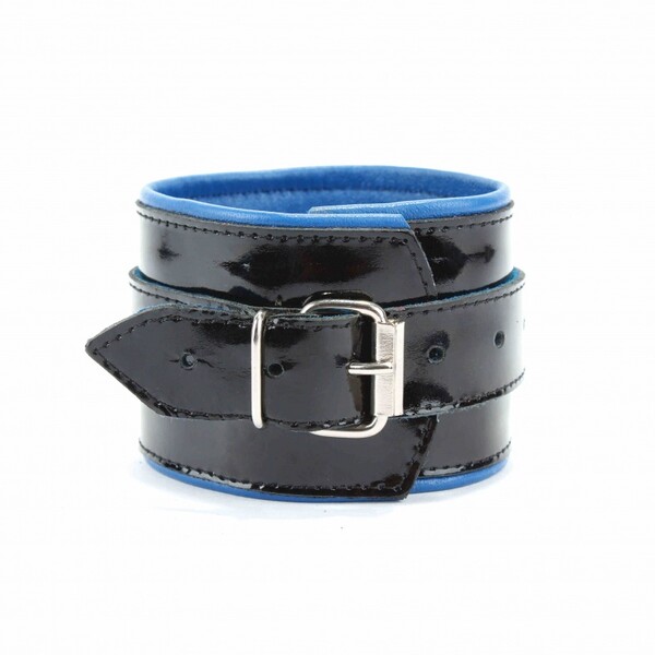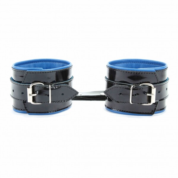 Наручники выполнены из черной натуральной лакированной кожи. Подклад изделия из синей перчаточной кожи. Аксессуар декорирован металлическими заклёпками.