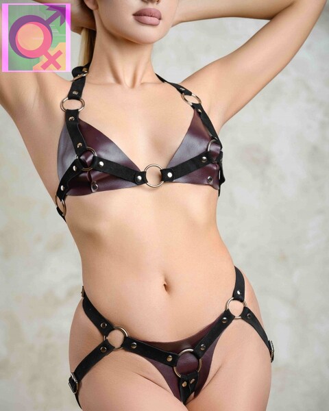 Лиф выполнен из натуральной кожи бордового цвета, декорировал ремнями из замши и металлическими кольцами . Лиф фиксируется ремнями и пряжками, позволяющими подобрать нужный размер.