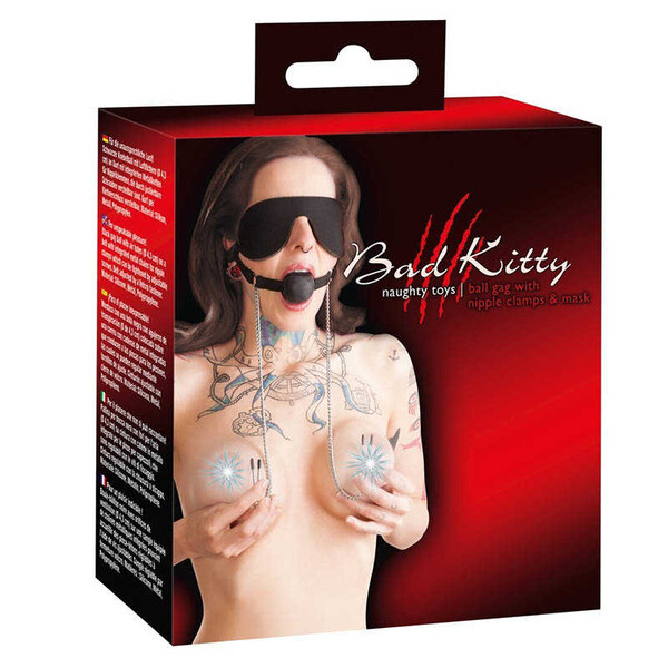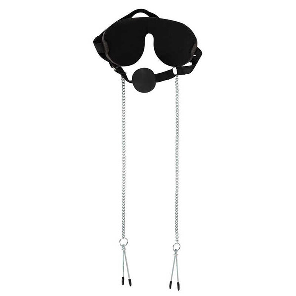 Отличный набор для БДСМ-сценариев. Маска с кляпом и зажимами на соски Mask with Ball Gag and Nipple Clamps позволит ощутить всю полноту ощущений при доминировании над партнером. Аксессуар из мягкой черной ткани полностью закрывает глаза, лишая возможности наблюдать происходящее вокруг. Конструкция соединена с крупным кляпом из силикона, выполненным в форме шара.