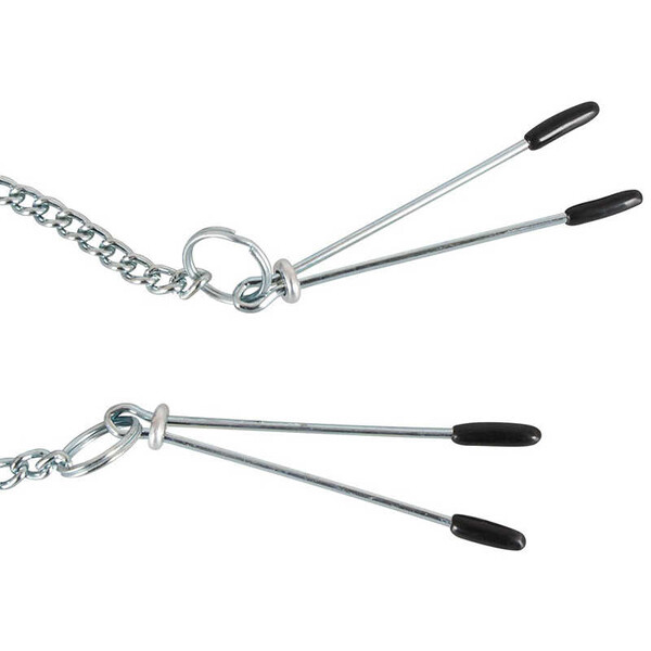 По обеим сторонам маски располагаются длинные хромированные цепочки с зажимами для сосков. Они позволяют усилить и разнообразить ощущения, возникающие в пылу любовной игры. Кончики зажимов покрыты силиконовыми накладками, что предотвращает возможность получения травмы. Размер универсальный – маска фиксируется на затылке при помощи широкой резинки, поэтому подойдет практически каждому.