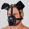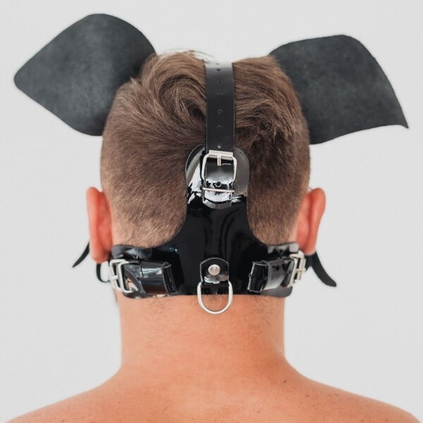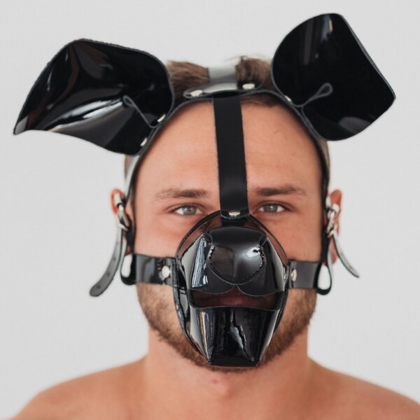 Маска выполнена из натуральной лакированной черной кожи. Детали надежно соединены заклепками. Маска фиксируется ремнями сзади.