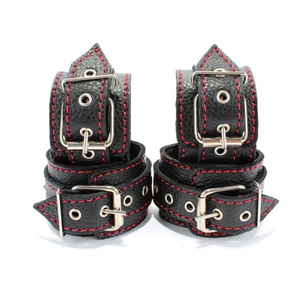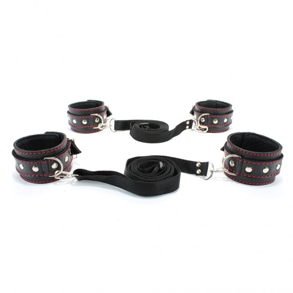 Набор для связывания состоит из наручников и оков, выполненных из натуральной черной кожи с контрастной красной строчкой, декорированных холнитенами, и двух бандажных ремней с карабинами. Длина ремней регулируется от 110 до 220см, ширина ремней 2см.Ширина оков и наручников 5см, ширина ремешков 2,5см.Аксессуары фиксируются на теле при помощи ремней и металлических пряжек.Наручники подойдут на обхват руки от 15 до 25см, оковы подойдут на обхват от 16 до 27см.