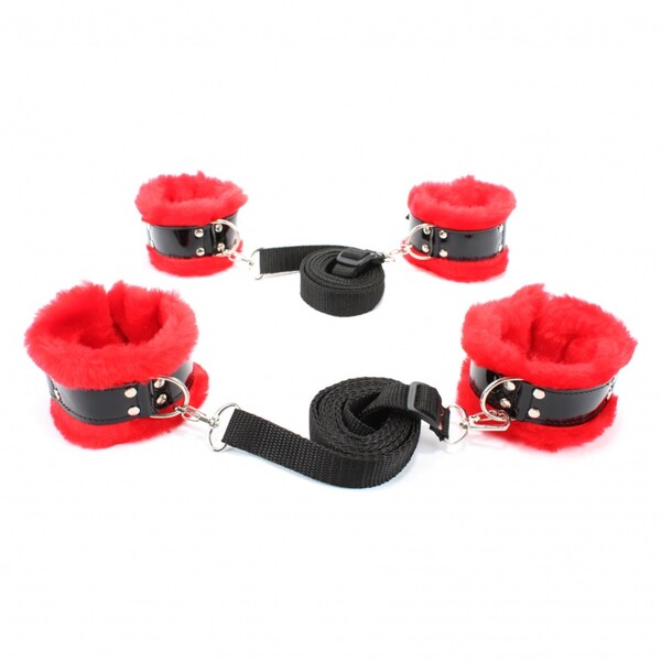 Набор для связывания состоит из наручников и оков, выполненных из красного меха с лакированными черными ремнями из натуральной кожи, двух бандажных ремней с карабинами. Аксессуары фиксируются на теле при помощи ремней и металлических пряжек, нежный мех сделает прибывание в образе максимально комфортным.
