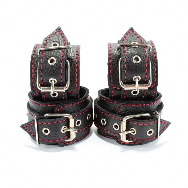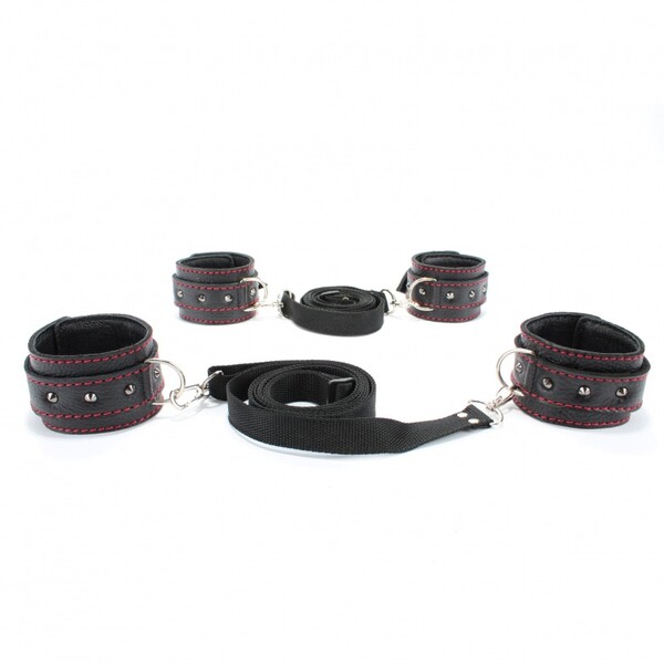 Набор для связывания состоит из наручников и оков, выполненных из натуральной черной кожи с контрастной красной строчкой, декорированных маленькими шипами, двух бандажных ремней с карабинами. Длина ремней регулируется от 110 до 220см, ширина лент 2см.Ширина оков и наручников 5см, ширина ремешков 2,5см.Аксессуары фиксируются на теле при помощи ремней и металлических пряжек.Наручники подойдут на обхват руки от 15 до 25см, оковы подойдут на обхват от 16 до 27см.