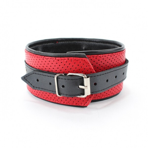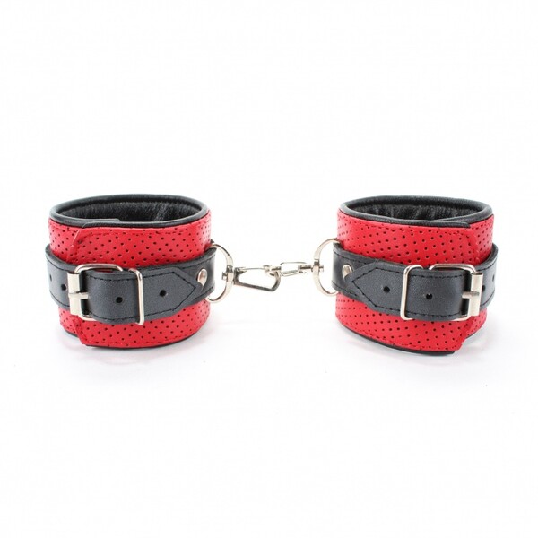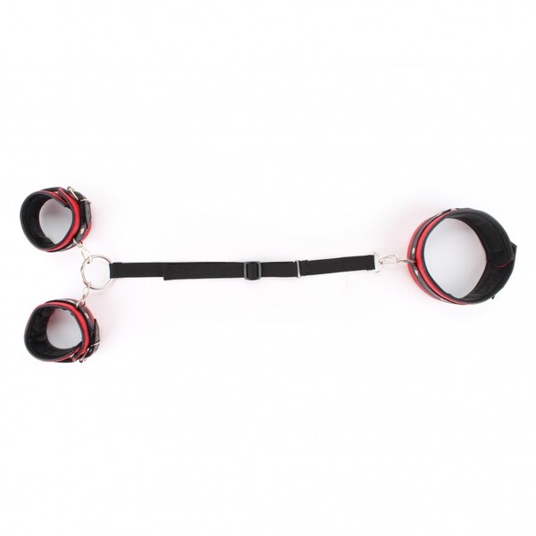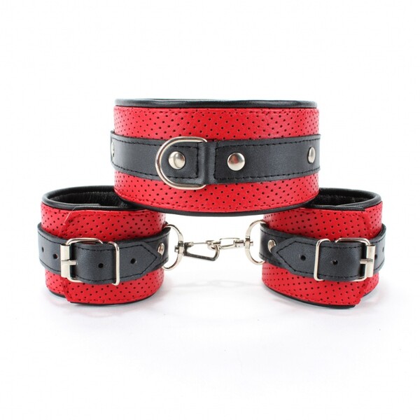 Набор фиксаторов из ошейника соединенного с наручниками с помощью ремешка из ранцевой ленты. Выполнен из натуральной кожи красного цвета с перфорацией, подклад из черной кожи. Ширина аксессуаров 5,5см, ширина ремешков 2см. Ошейник подойдет на обхват от 27 до 38см, наручники на обхват от 14 до 23см. Длина ленты регулируется от 14 до 58см, на одном ее конце находится карабин для ошейника, а на другом кольцо для крепления наручников.