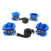 Набор для связывания состоит из наручников и оков, выполненных из синего эко-меха с лакированными черными ремнями из натуральной кожи, шириной 3 см.Так же, в комплект входят 2 бандажных ремня с карабинами. Аксессуары фиксируются на теле при помощи ремней и металлических пряжек, нежный мех сделает прибывание в образе максимально комфортным. Наручники подойдут на обхват от 18 до 27 см, наножники подойдут на обхват от 20 до 30 см. Бандажные ленты можно регулировать по длине от 110 до 220 см, их ширина 2 см.Не ограничивай себя во власти или получай удовольствие от сладких ограничений!