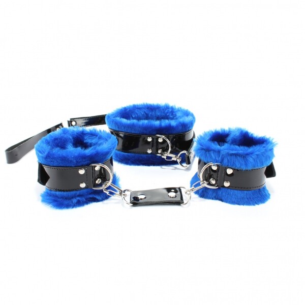 Наручники и ошейник выполнены из синего эко-меха. Ремни на аксессуарах и поводок выполнены из натуральной черной лакированной кожи, ширина ремешков 3 см. Наручники и ошейник фиксируются на теле при помощи ремней и металлических пряжек, нежный мех сделает прибывание в образе максимально комфортным. Ширина аксессуаров 6 см. Ошейник подойдет на обхват от 28 до 37 см, общая длина поводка 55 см, ширина ремешка 2 см, длина петельки для руки 14 см. Наручники подойдут на обхват от 18 до 27 см, общая длина соединения с карабинами 12 см. Этот комплект подарит игривое настроение и незабываемые впечатления от БДСМ игры!