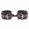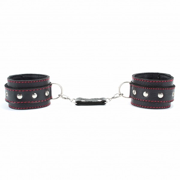 Оковы выполнены из черной натуральной кожи с красной контрастной строчкой. На ремнях украшение в виде металлических холнитенов, ширина оков 5см, ширина ремешков 2,5см.Оковы надежно фиксируются пряжками и ремнями, позволяющими выбрать нужный размер, подойдут на обхват от 18 до 27см.Кожаное соединение на карабинах фиксирует оковы вместе, общая длина соединения 12см.