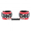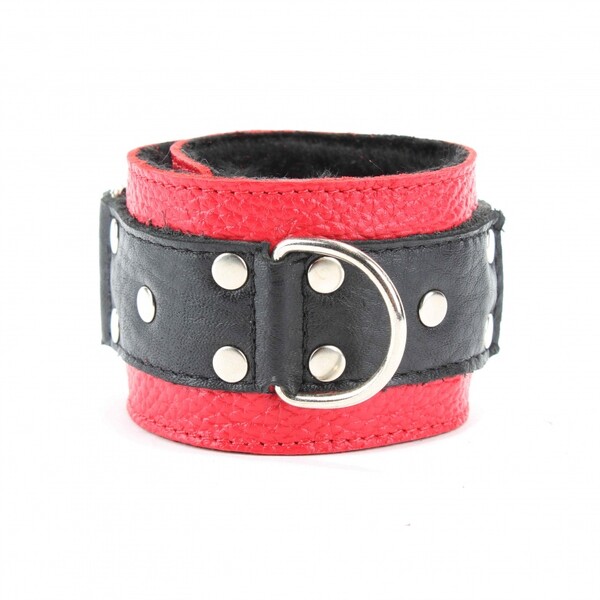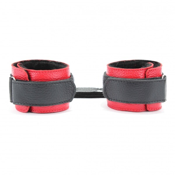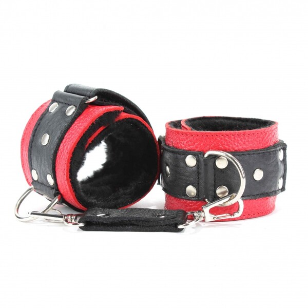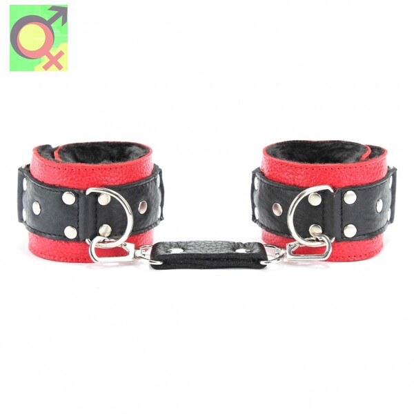 Наручники выполнены из красной натуральной кожи, легко, но надежно фиксируются черными ремнями на липучке, позволяя выбрать нужный размер,подойдут на обхват руки от 20 до 30см.Ширина наручников 5,5см, ширина ремешков 3см.Аксессуар декорирован заклепками. Кожаное соединение на карабинах фиксирует наручники вместе, общая длина соединения 14см.Мягкий подклад из меха обеспечит комфортное пребывание в образе, помогая полностью погрузиться в БДСМ игру.