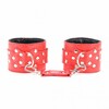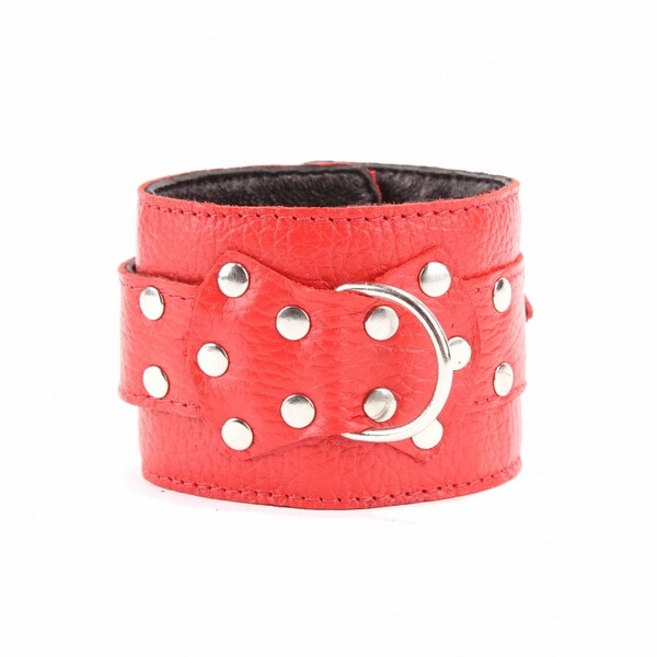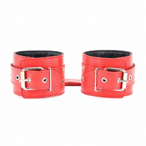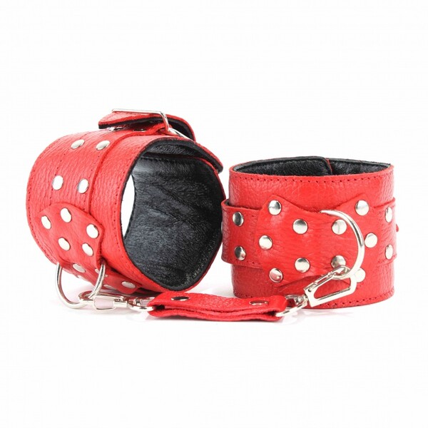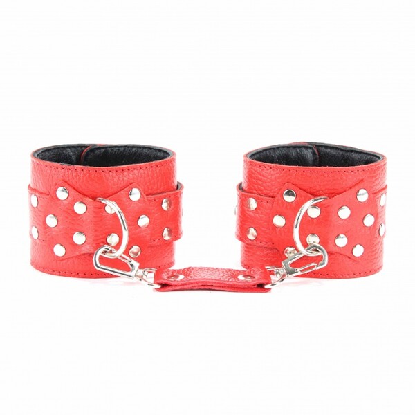 Наручники выполнены из натуральной кожи красного цвета. Декорированы заклепками и бантом с металлическим кольцом.Ширина наручников 6см, ширина ремешков 3см.Наручники надежно фиксируются пряжками и ремнями, позволяющими выбрать нужный размер,подойдут на обхват руки от 16 до 25см. Нежный подклад из черной кожи обеспечивает комфорт, кожаное соединение на карабинах фиксирует наручники вместе, общая длина соединения 14см. Аксессуар позволяет в полной мере насладиться сексом в стиле БДСМ.