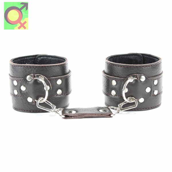 Наручники выполнены из натуральной мягкой кожи темно-коричневого цвета. Изделие декорировано заклепками. По середине расположено полукольцо из сварной фурнитуры. Наручники надежно фиксируются пряжками и ремнями, позволяющими выбрать нужный размер,подойдут на обхват руки от 16 до 24см,ширина ремешков 3см.Кожаное соединение на карабинах фиксирует наручники вместе, общая длина соединения 14см.Ширина наручников 6см.Приятные для тела и стильные наручники отлично подходят для воплощения эротических БДСМ игр.