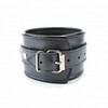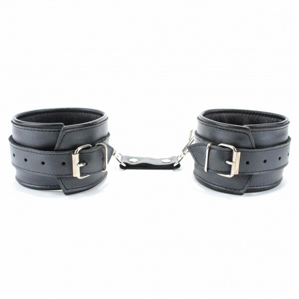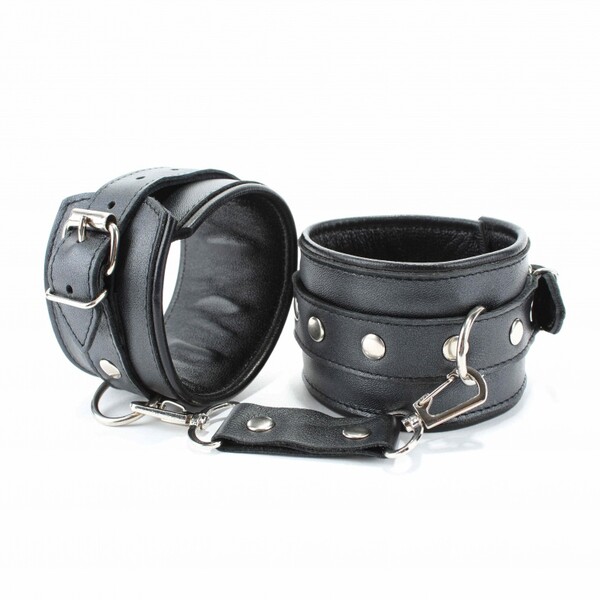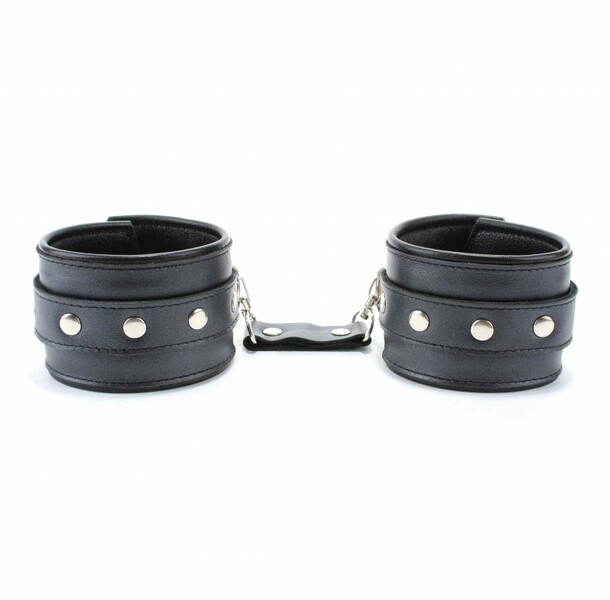 Наручники выполнены из гладкой черной натуральной кожи. Изделие декорировано металлическими заклёпками. Наручники надежно фиксируются пряжками и ремнями, позволяющими выбрать нужный размер. На каждом аксессуаре полукольцо из сварной фурнитуры.