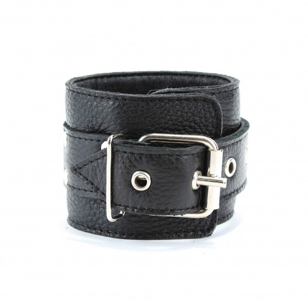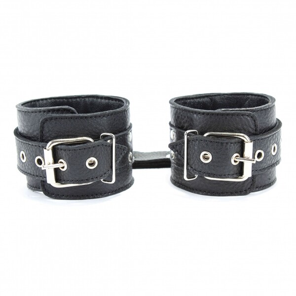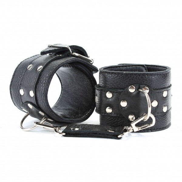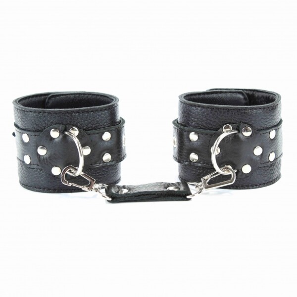 Наручники выполнены из натуральной кожи черного цвета. Изделие декорировано заклепками. По середине расположено полукольцо из сварной фурнитуры. Наручники надежно фиксируются пряжками и ремнями, позволяющими выбрать нужный размер,подойдут на обхват руки от 18 до 26см,ширина ремешков 3см.Кожаное соединение на карабинах фиксирует наручники вместе, общая длина соединения 14см.Ширина наручников 6см.Приятные для тела и стильные наручники отлично подходят для воплощения эротических БДСМ игр.