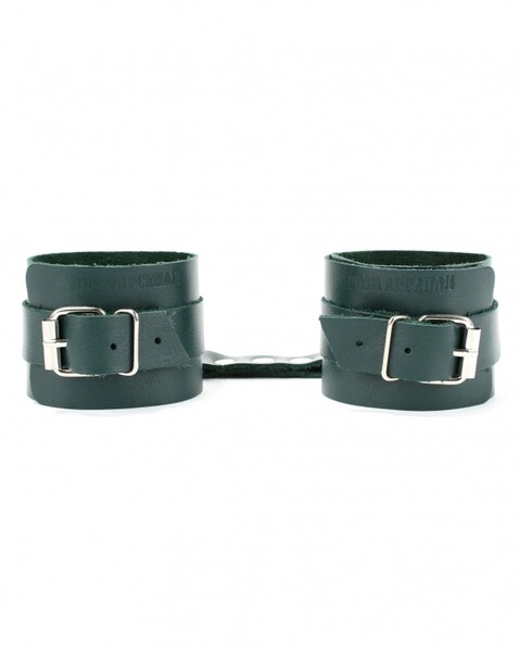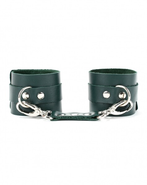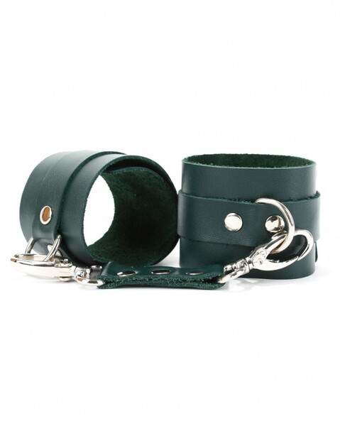 Оковы выполнены из натуральной кожи изумрудного цвета. Металлическая пряжка крепко удерживает в подчинении, кожаное соединение на карабинах фиксирует наручники вместе, ремни позволяю выбрать нужный размер.