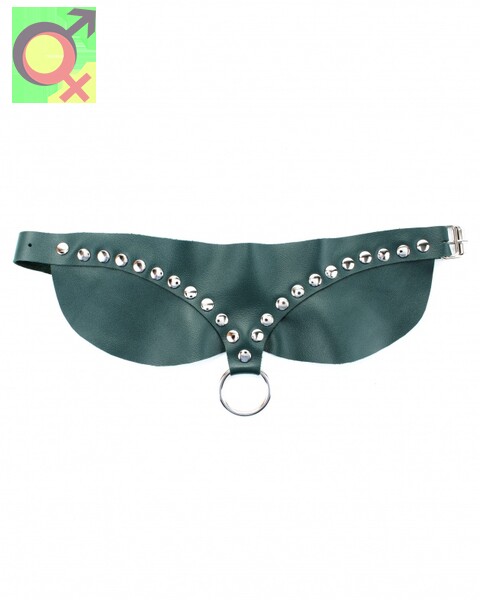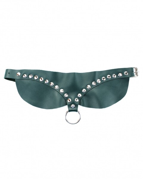 Ошейник выполнен из натуральной кожи изумрудного цвета, декорирован заклепками в иде V символа и металлическим кольцом спереди. Сзади аксессуар надежно фиксируется пряжкой, ремень позволяет выбрать нужный размер.