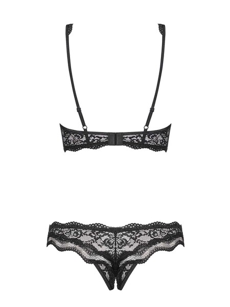 Открытый бюстгальтер красиво приподнимет грудь и придаст ей изумительную форму, а трусики с открытым вырезом добавят пикантности.