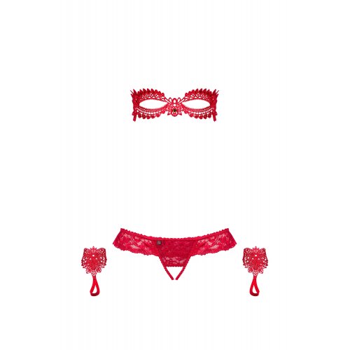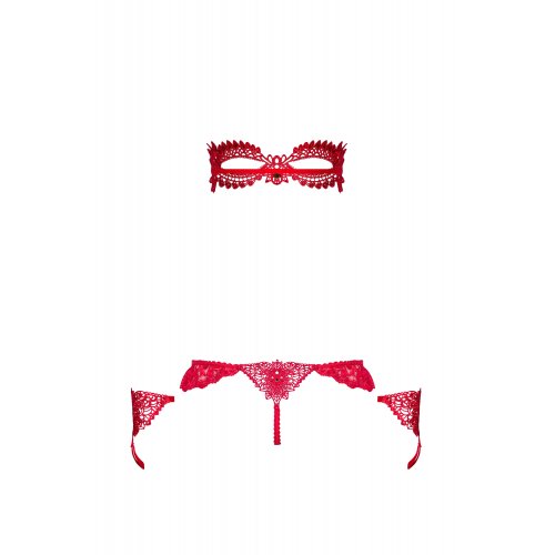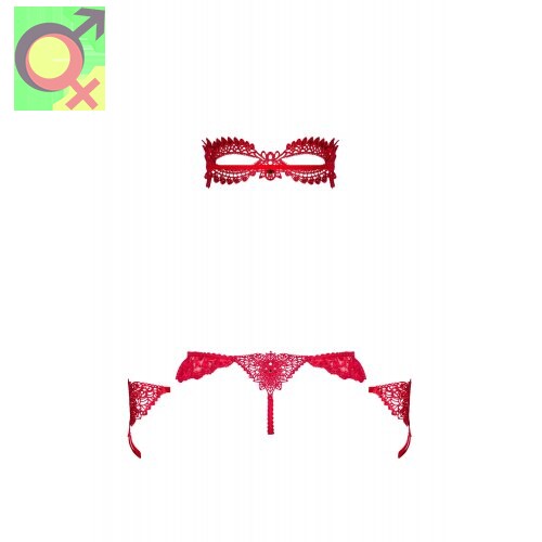 В комплект входят: маска, перчатки, трусики-стринги с открытой промежностью.