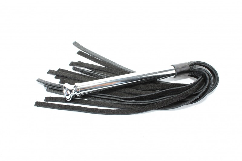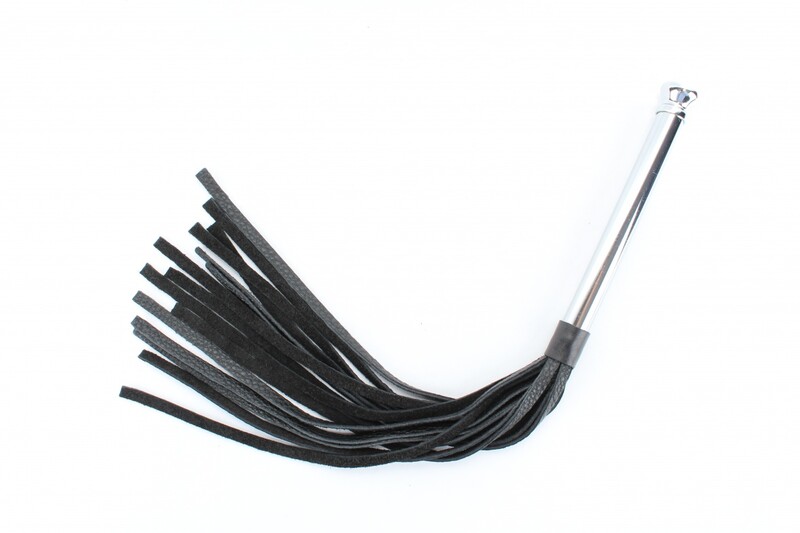Небольшая плеть с металлической ручкой длиной 16 см. и диаметром 1,5 см. Хвосты выполнены из кожи черного цвета, их длина составляет 28 см, количество - 15 штук. Общая длина изделия 43см.