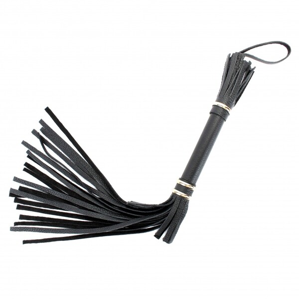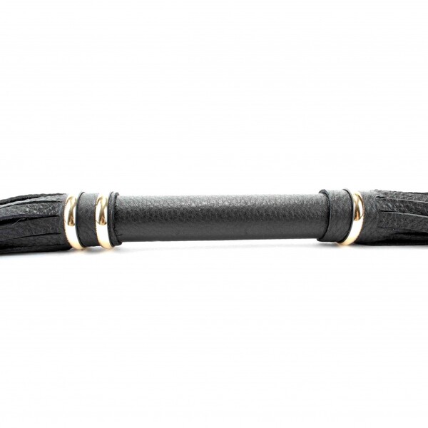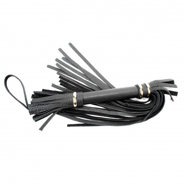 Плеть выполнена из натуральной кожи черного цвета. Рукоятка гладкая, декорирована золотым кольцом в начале и двумя кольцами у хвоста. Длина изделия 45 см. Мягкие хвосты плети доставят незабываемое впечатление, позволят партнерам воплотить самые сокровенные желания.
