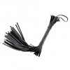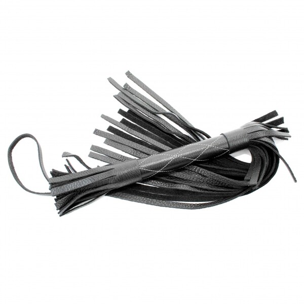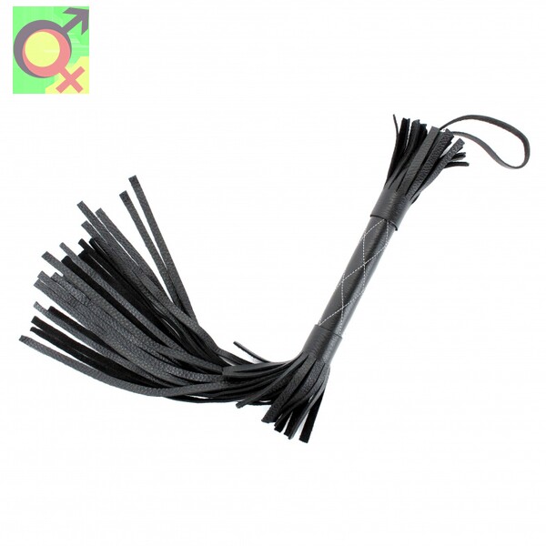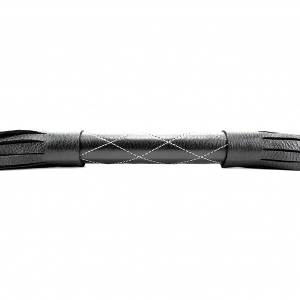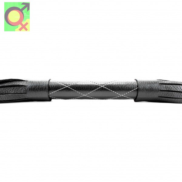 Плеть выполнена из натуральной кожи черного цвета. Рукоятка декорирована прострочкой белыми нитками в форме ромба.Дина рукоятки -16 см., диаметр - 2,5 см., в верхней части части для удобства расположена петелька длиной 18см. Хвосты плети мягкие, их длина составляет 29 см. Длина изделия полностью - 45 см. Количество хвостов - 20 штук.