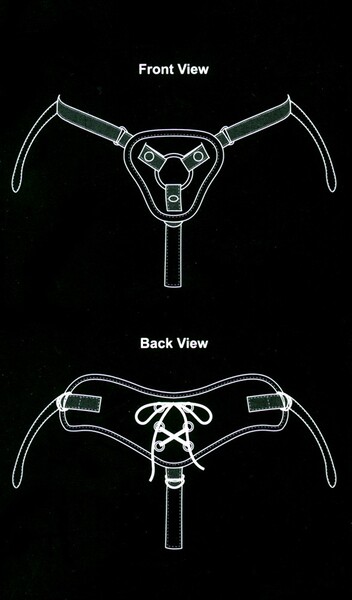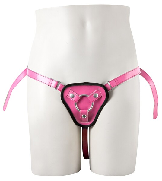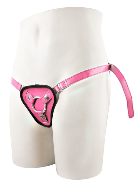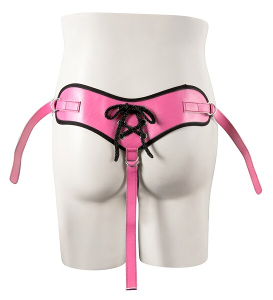 Розовый синтетический кожаный ремешок с черными швами и игривой шнуровкой на пояснице. Размер индивидуально регулируется ремнями на бедрах и промежности. Впереди с помощью защелок прикрепляется кольцо (два прилагаемых размера), в качестве держателя для фаллоимитатора (нет в наборе).
