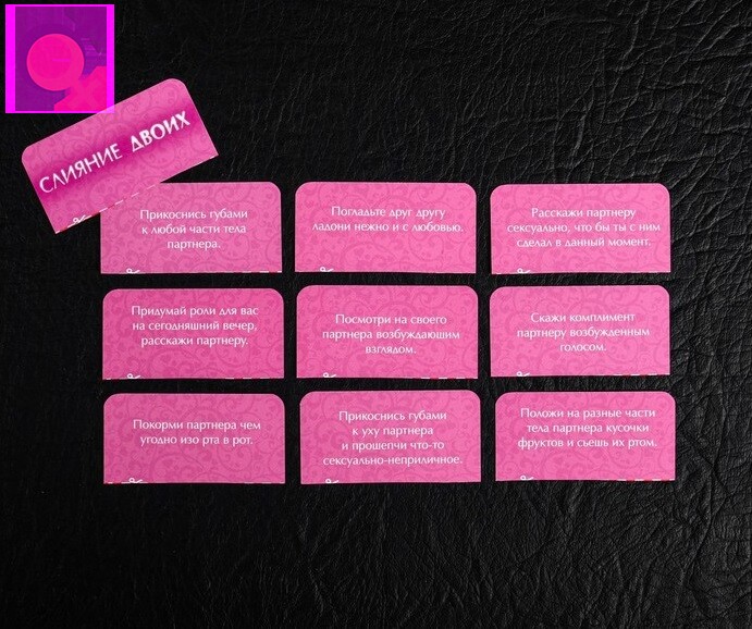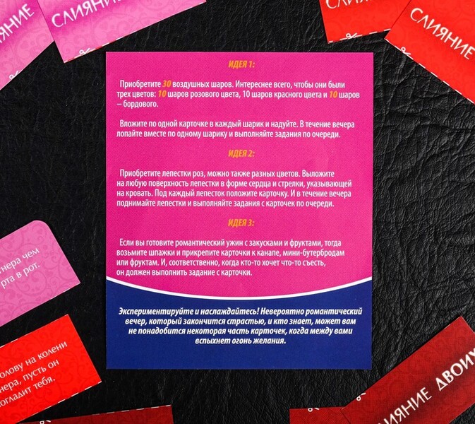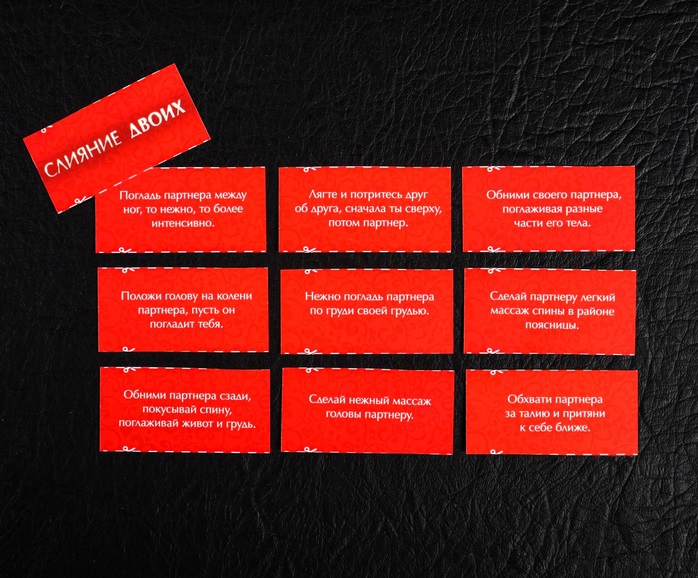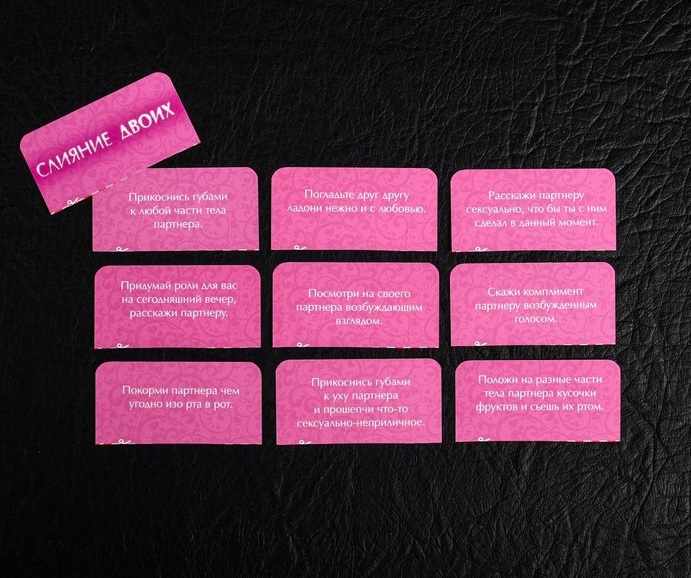 Разрежьте карточки по пунктирным линиям. У вас получится три колоды — розового, красного и бордового цветов. Начните с розовых — вытягивайте их по очереди и выполняйте задания. Затем переходите к красным, более жарким картам, и, наконец, к бордовым. Воплотите в жизнь эти идеи, и ваша ночь будет незабываемой!