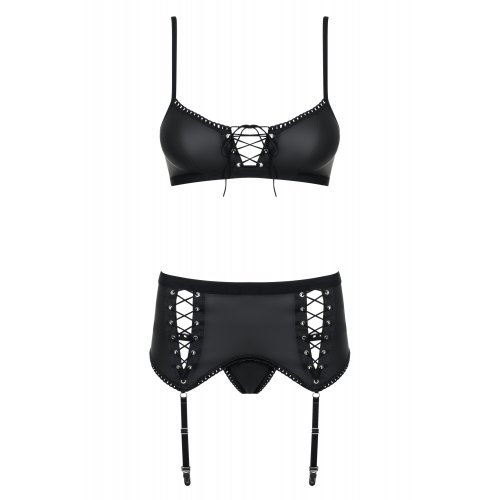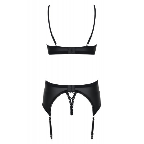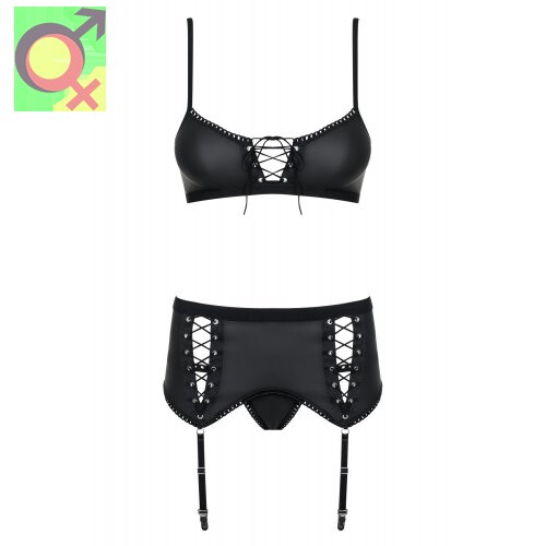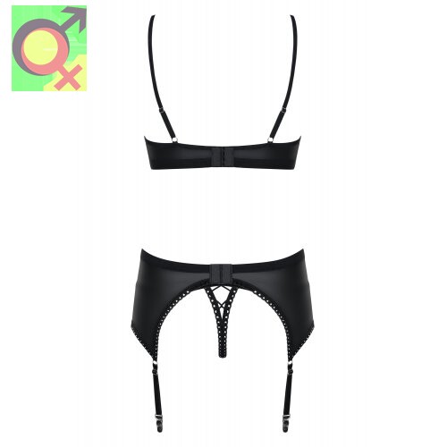 В комплект входят бюстгальтер, пояс для чулок и стринги.