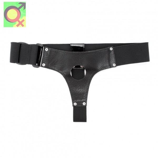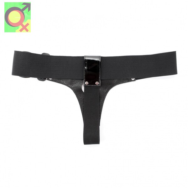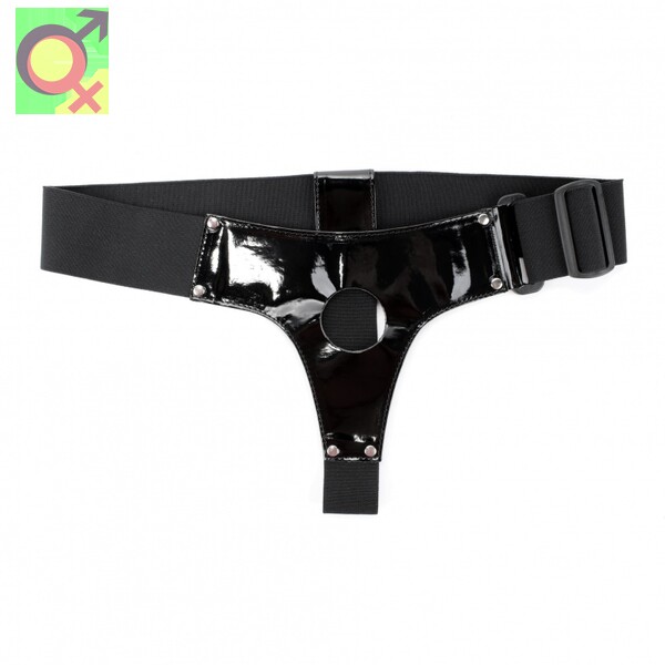Трусики выполнены из лакированного кожзама черного цвета с элементами из черных эластичных резинок, надежно фиксирующих изделие на теле.