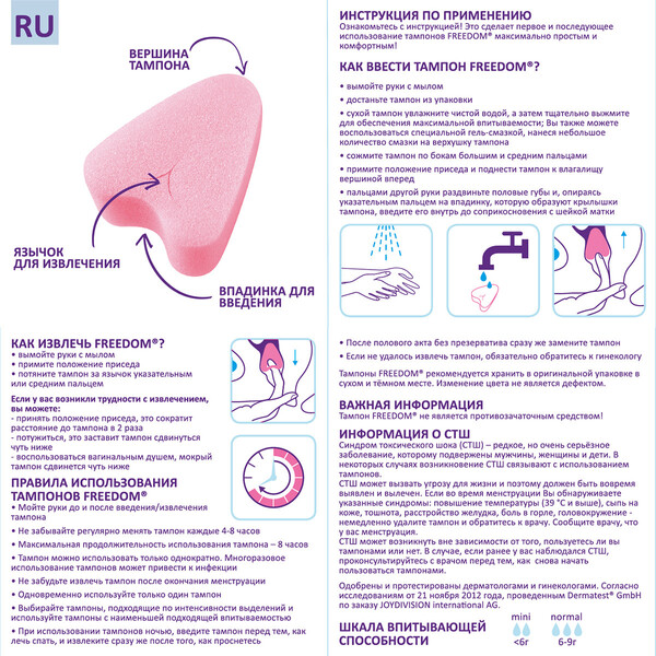 Тампоны нового поколения FREEDOM®без веревочки! Тампоны FREEDOM®обеспечивают не только надежную защиту от выделений в критические дни, но и дают возможность не отказываться от своих обычных увлечений и планов! Любовь, спорт, SPA, танцы или бассейн – с FREEDOM®все это возможно даже в критические дни!